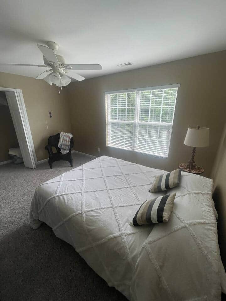 Make Beach happy offers a queen bed in master bedroom with 45 in tv. The second bedroom has queen bed and Tv. The third bedroom offers a full size bed with TV. Full size bathroom is in the hallway for all bedroom access. First floor offers another full size bathroom and is equipped with a full kitchen, a living area, dining area, washer and dryer, WIFI, and relaxing back yard with a pool.